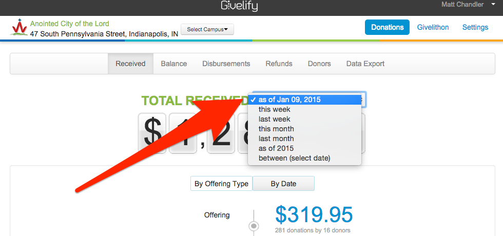 On the Received screen in the Donations section, there is a new dropdown menu beside Total Received. You can view donations received during the current week or month, the previous week or month, year-to-date, or select a custom date range.