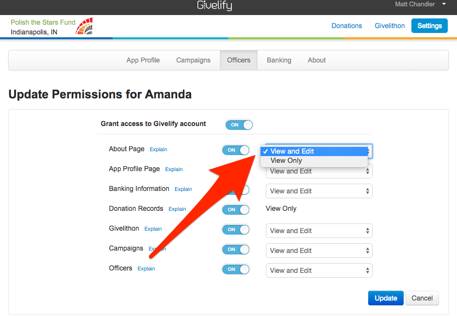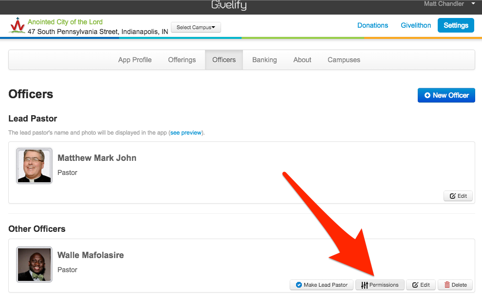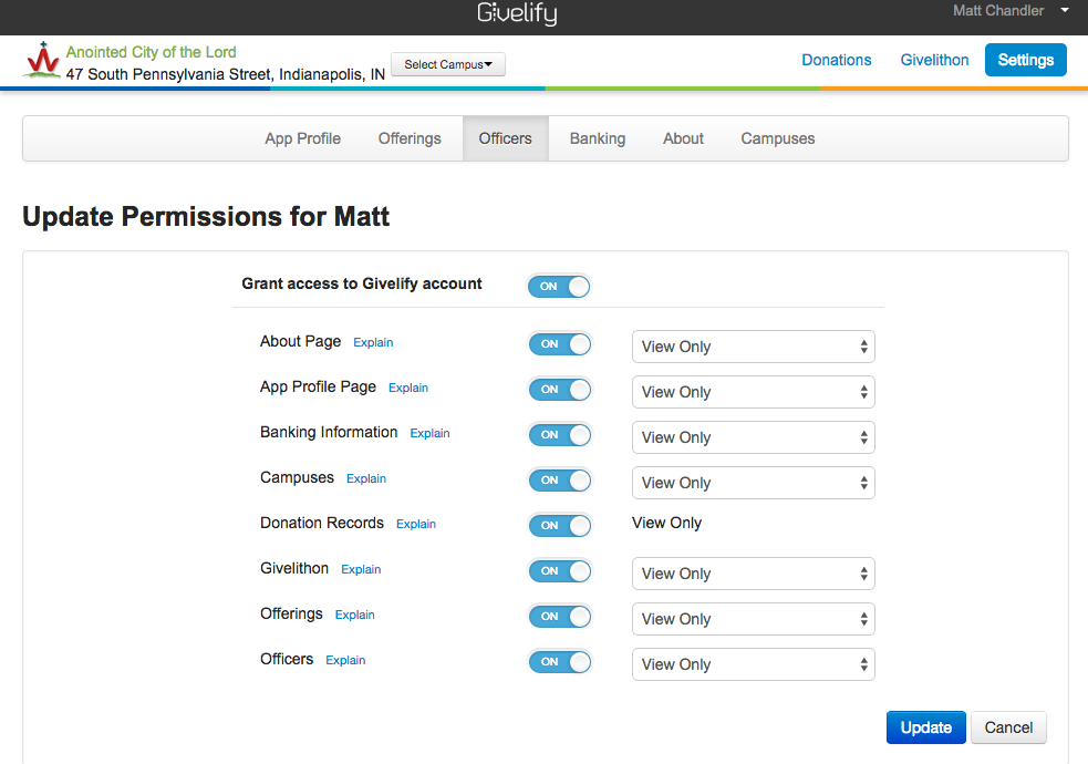 Some of your church officers may only need access to certain sections of the donation management dashboard. For example, your bookkeeper may need to access the Banking Information and Donation Records sections, but not have the capability to create new offerings.