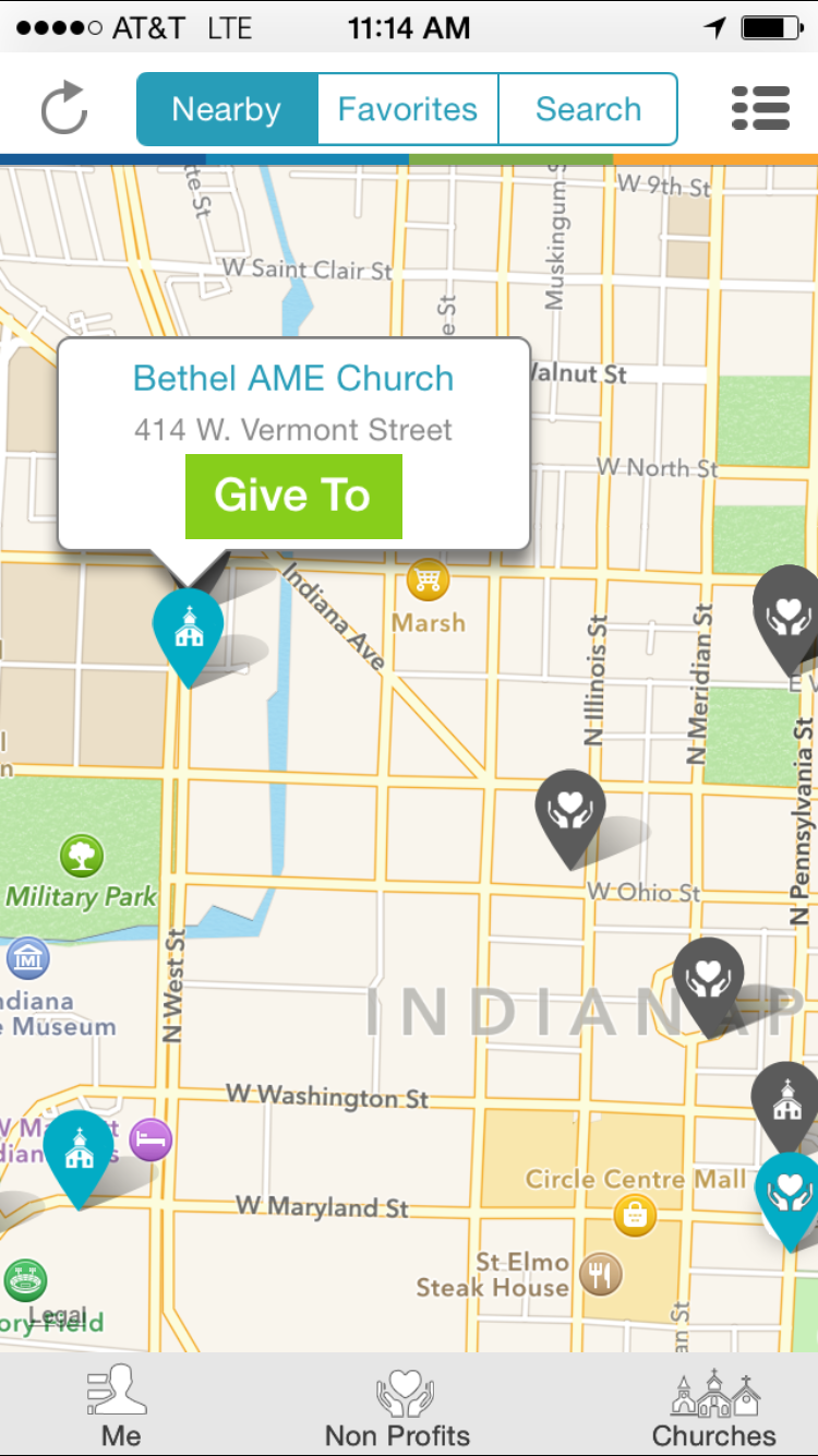 When logged in to the Givelify giving app, tap the Nearby tab at the top of your screen. You will then see a map of all the churches and nonprofits in the area based on your current location.