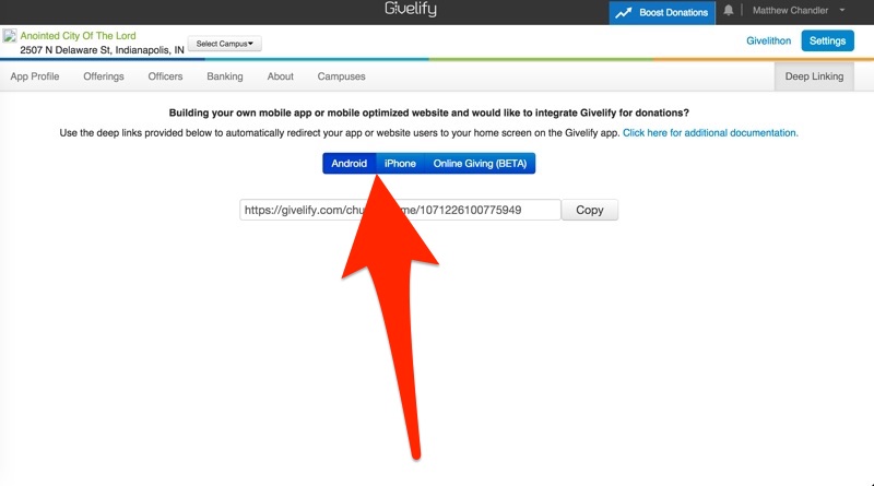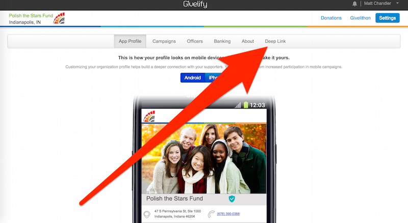5. Select Android or iPhone to display the deep link that will invoke your organization’s profile on the Givelify app.