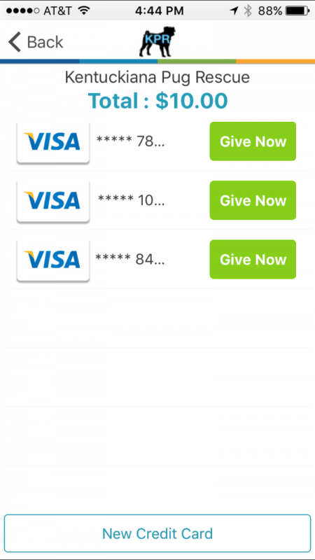 You can add or update your credit or debit card information by beginning the donation process. After you select your donation amount and reach the “1-Tap Give Now” screen, tap “Use Different Payment.“